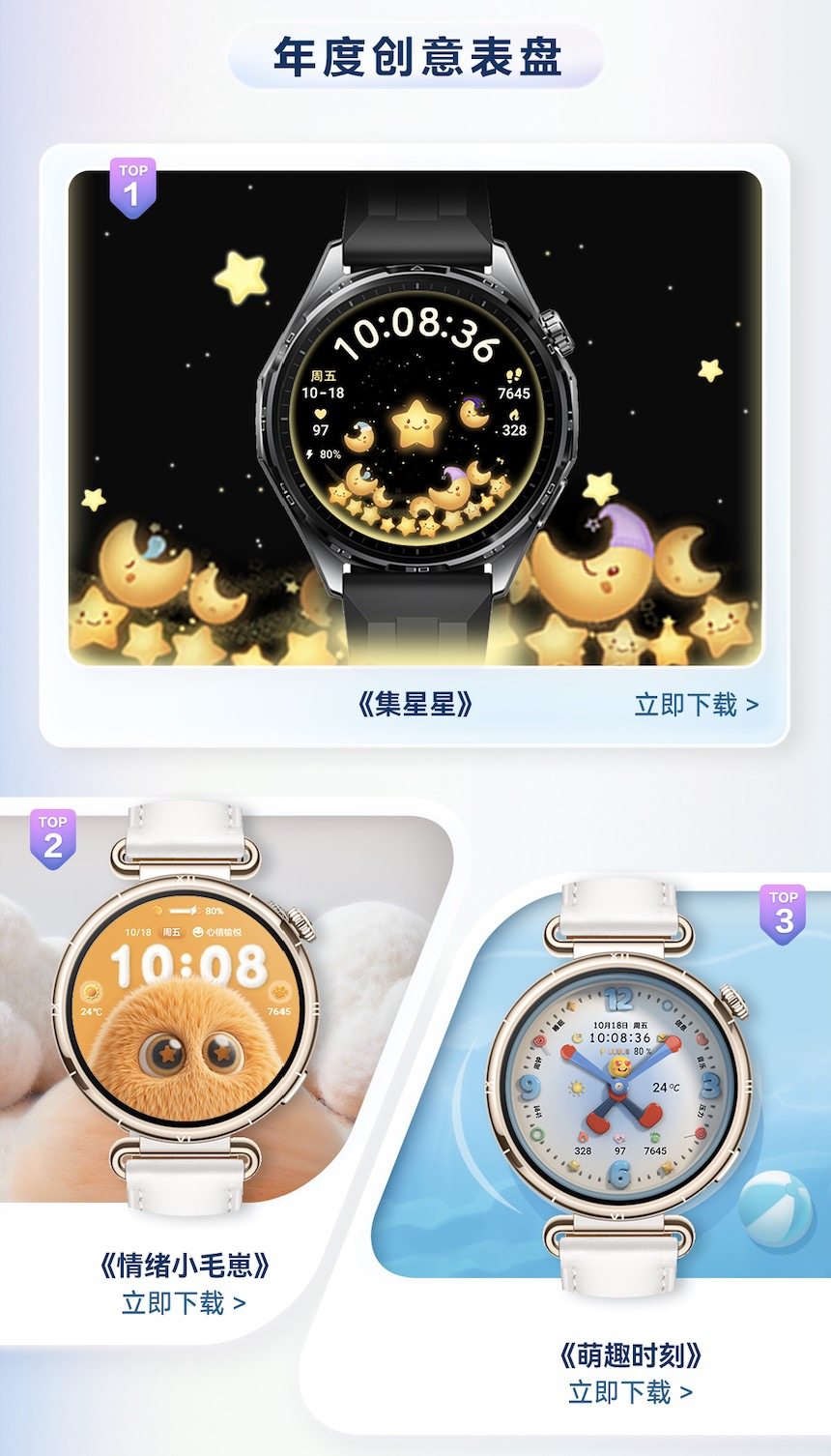 不仅是主题,表盘也有独立榜单,最让我心水的就是“年度创意表盘”里的《萌趣时刻》和《情绪小毛崽》。前者的星星和糖果小图标,看一眼都是快乐的滋味。后者有超多大脸小毛崽,情绪不详,全看工作压强,简直是在演我的牛马一天。
