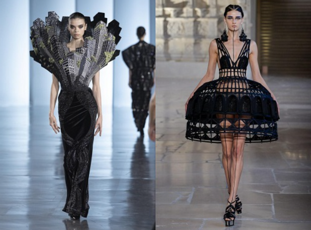 裙摆和巨大的翅膀上,嵌满了高透明度玻璃材质的彩窗碎片,这设计真的是神来之笔了!彩窗碎片的灵感源自哥特式教堂建筑,经拆解重构后融入时装设计,颜色丰富的流光在碎片里缓缓流转,一动就像星尘骤然迸发,既有哥特建筑的华丽庄严,又藏着暗夜独有的忧郁深邃,破碎感和仪式感直接拉满。